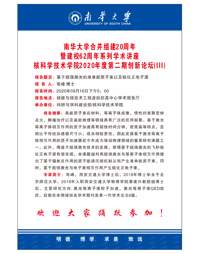 华体会平台合并组建20周年暨建校62周年系列学术讲座--基于超强激光的准单能质子束以及化正电子源