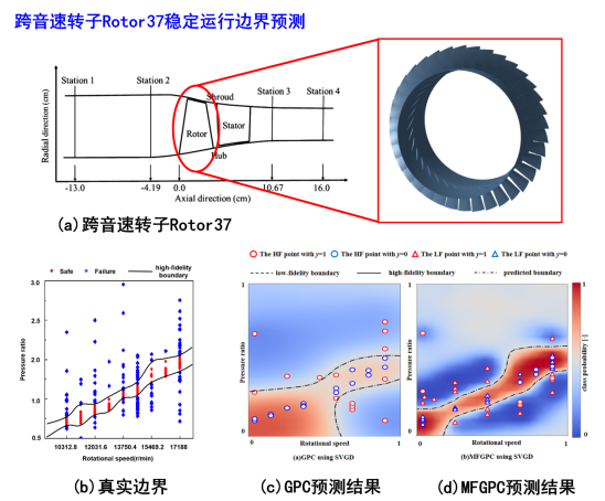 将所提方法应用于近零泊松比结构的失效边界和压气机转子安全运行边界的预测。预测结果如下两图显示。所提方法的建模精度和速度均优于现有模型,验证了所发展方法的有效性和工程实用性。所提方法还能为多可信度贝叶斯优化算法提供新型的可行域边界预测途径。