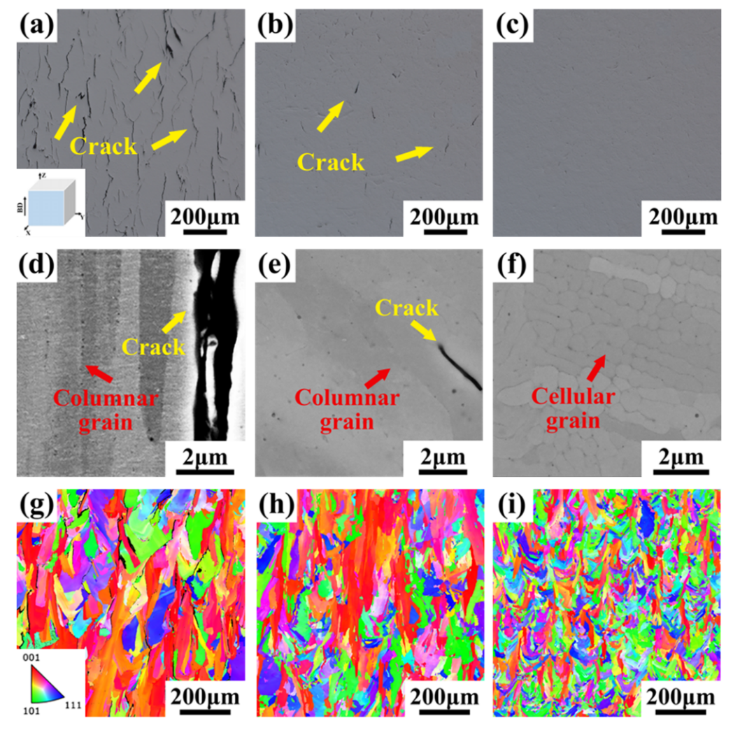 图1 采用LPBF设备制备CCN、CCN-0.4B和CCN-0.8B合金的微观结构:(a)-(c)光学显微镜(OM)图;(d)-(f)扫描电子显微镜(SEM)图;(g)-(i)电子背散射衍射(EBSD)图