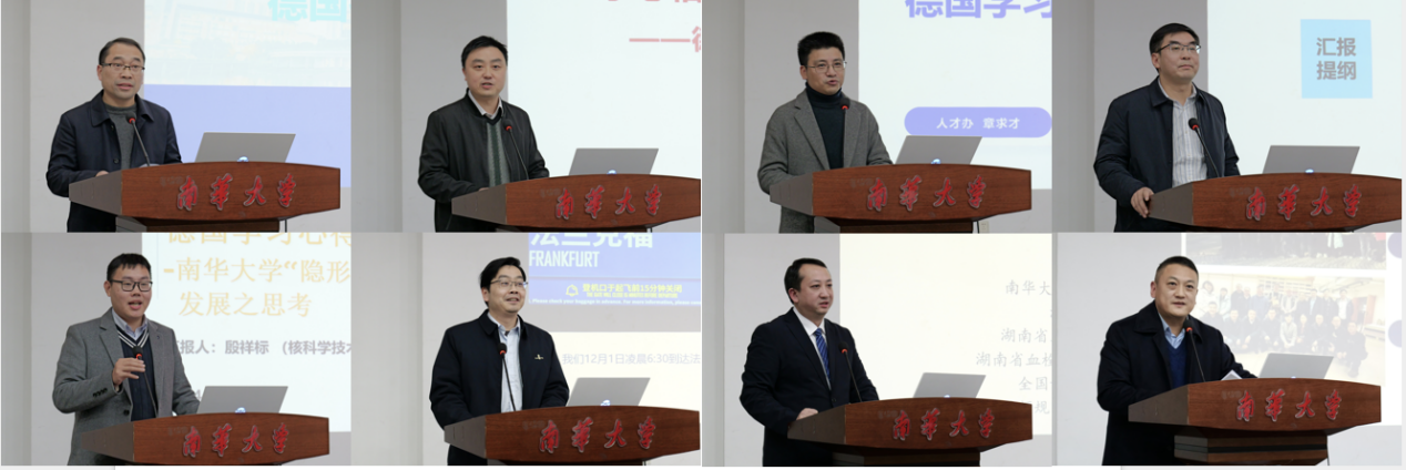 团组分享环节由培训团团长、党委组织部常务副部长谢四平主持。培训团副团长、研究生院院长李乐以“学思悟并举 奋进双一流”为题,详细介绍了德国的高等教育体系、学科建设、人才培养、科研创新与技术应用等方面的先进经验,深入剖析了双元制职业教育体系、智能制造、“隐形冠军”企业以及汽车工业转型等议题,并就学校如何在“双一流”建设与高质量发展中交流互鉴、扬长避短提出了建议。土木工程学院院长谢东,核科学技术学院核化工与核燃料工程系主任、先进核燃料循环化工研究中心副主任殷祥标,人力资源处副处长、人才工作办公室副主任章求才,衡阳医学院党委书记、小组长曾国,附属第二医院大外科副主任、普通外科主任邓礼明,经济管理与法学学院党委书记胡海波等6位团组成员代表结合自身和部门工作实际,分享了培训体验,并从不同角度阐述了对德国工业4.0、隐形冠军企业、人才国际化战略、双元制教育、医教研协同等方面的深刻理解。