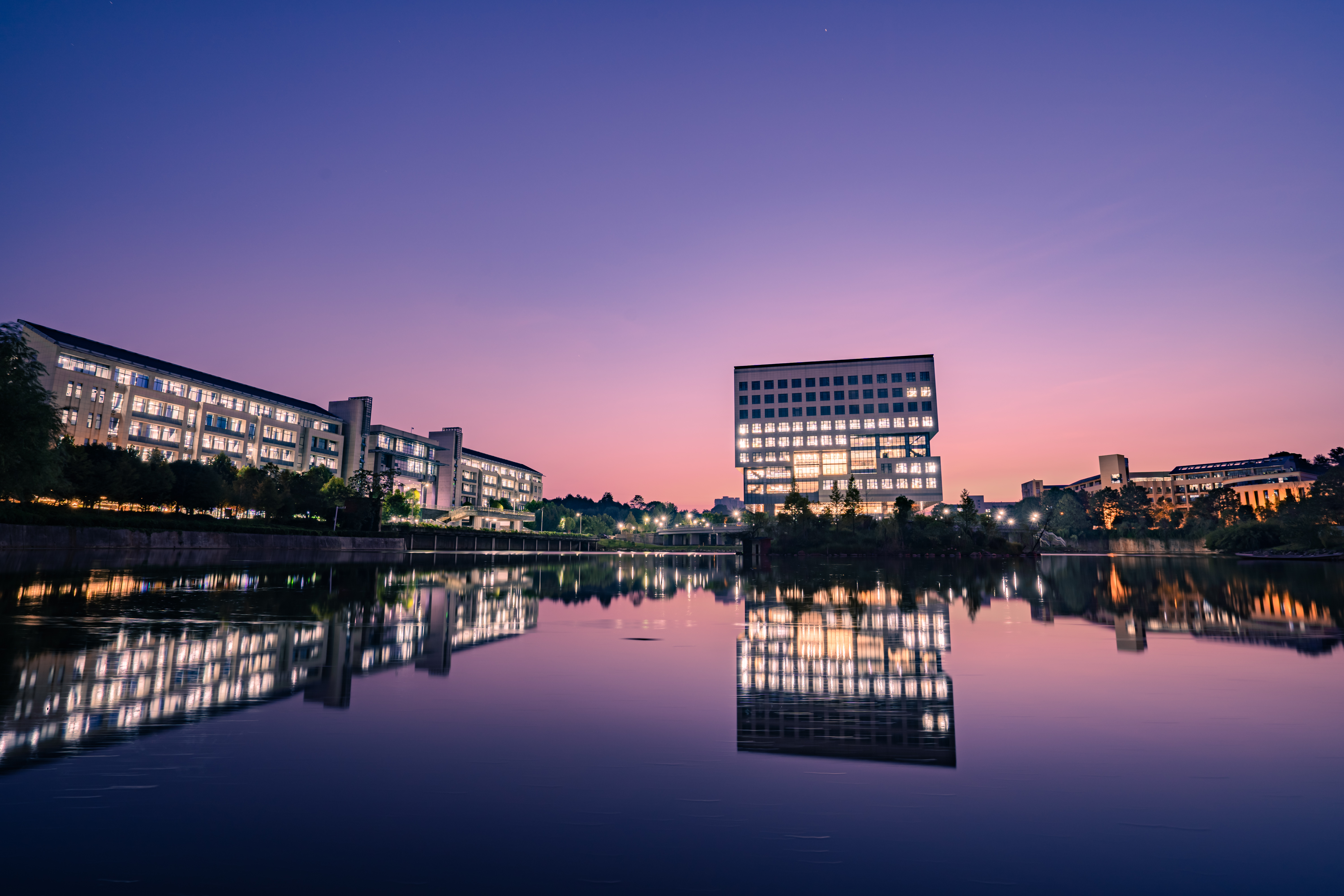 晚霞与灯光映照下的新图书馆美轮美奂